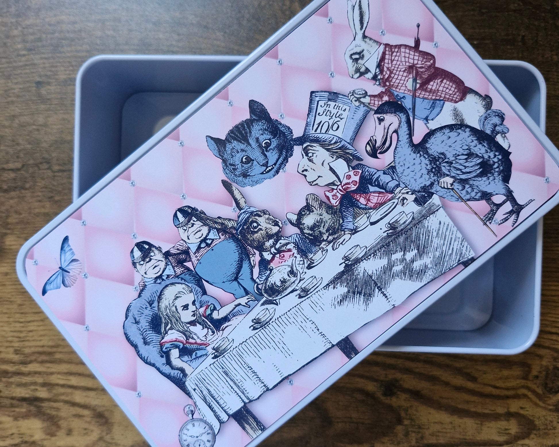 A handy tin to store bits and bobs in, with apink Tea Party Alice in Wonderland design.