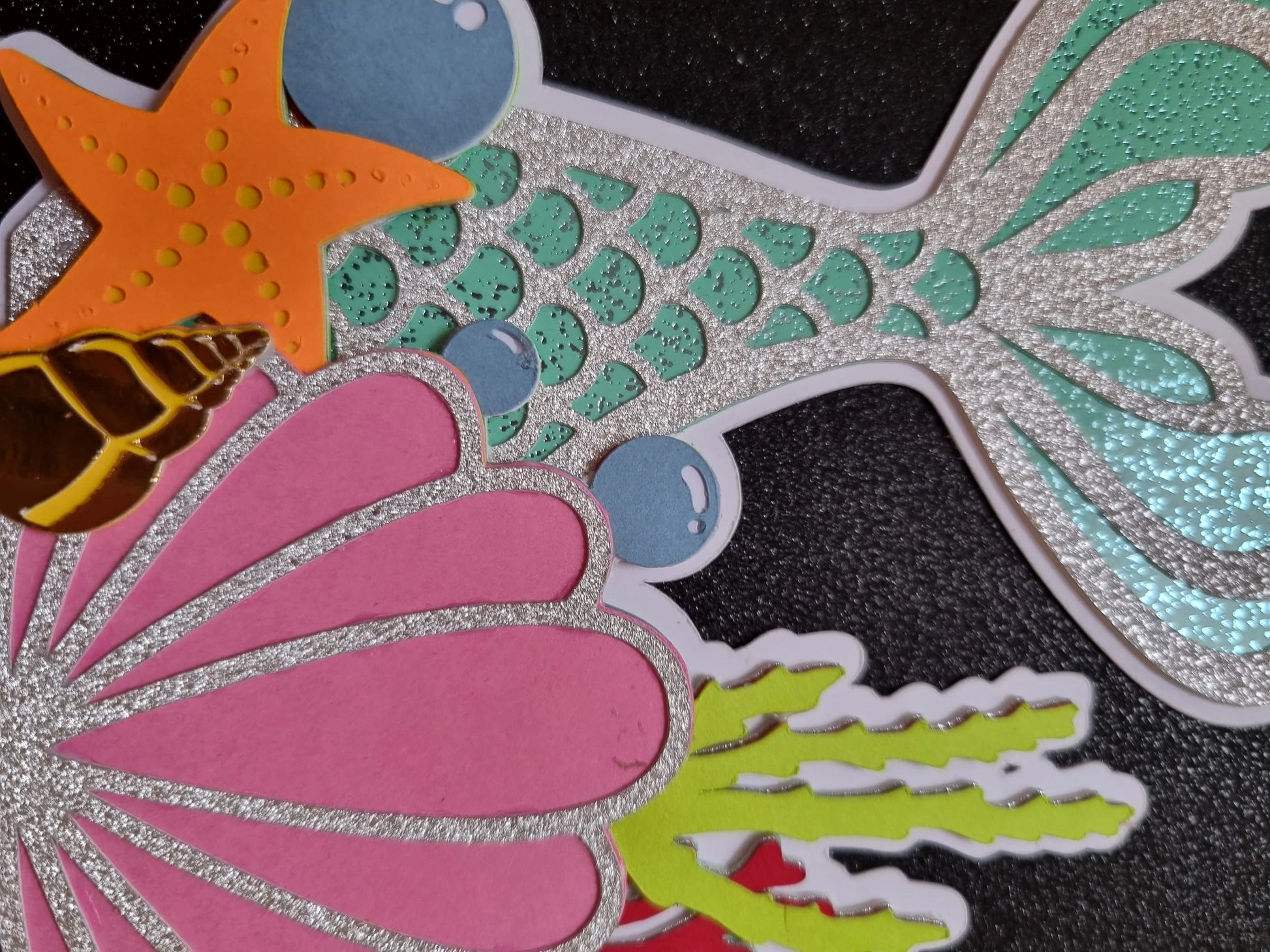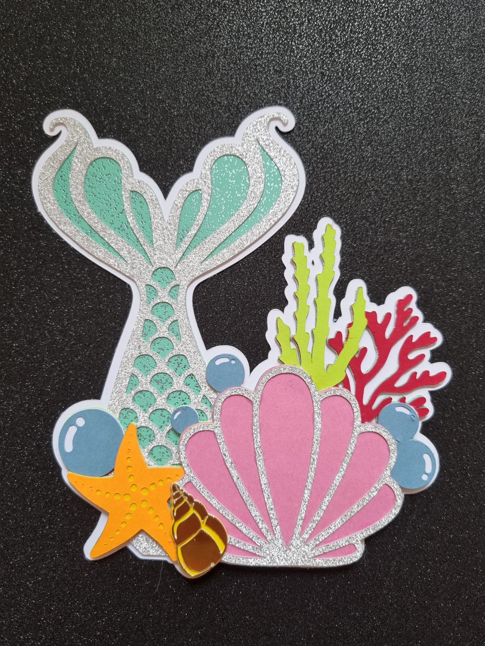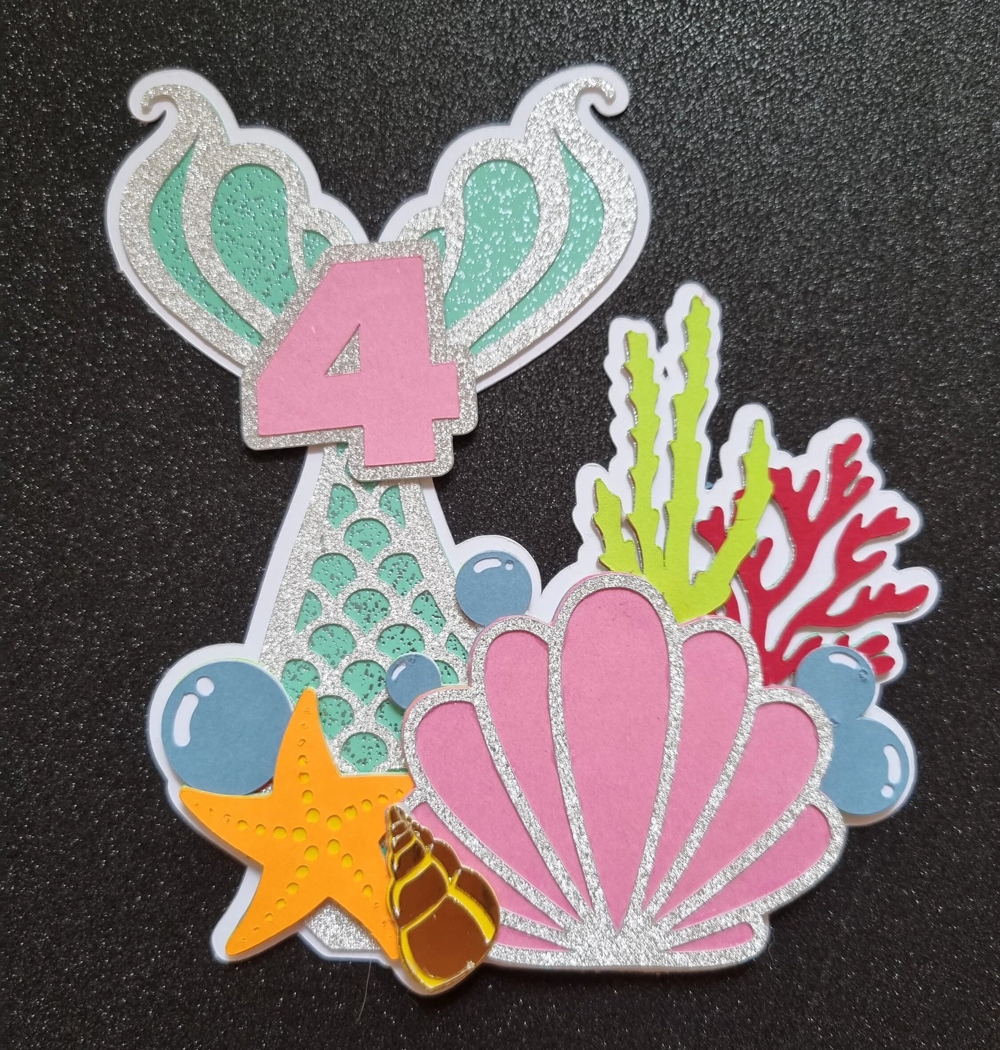 Handmade mermaid themed cake topper, layered to give a 3d effect and add strength to the topper.